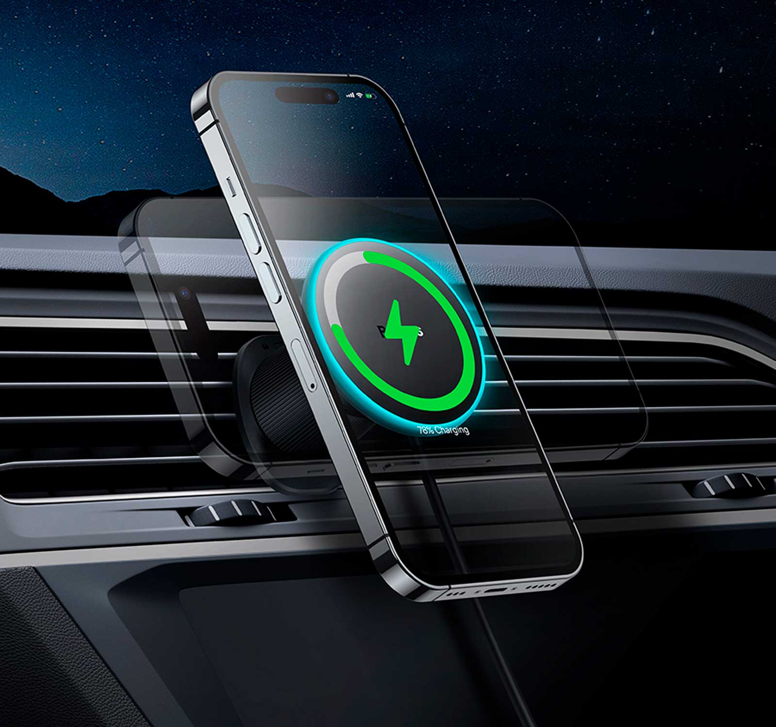 После установки телефона на держатель он будет заряжаться мощностью 15 Вт по беспроводной сети. Питание устройства осуществляется через кабель, подключенный к автомобильному адаптеру.
