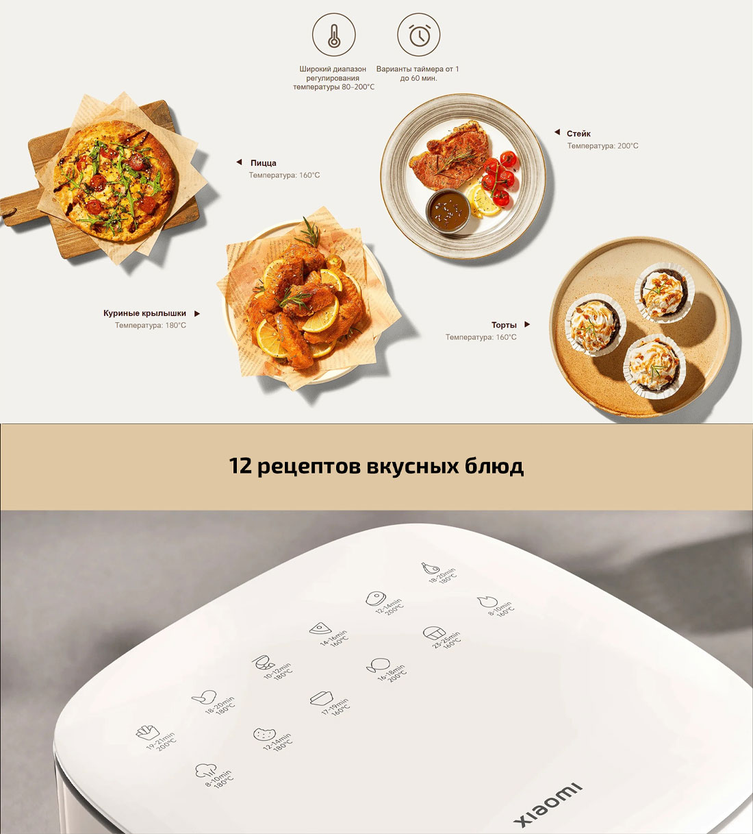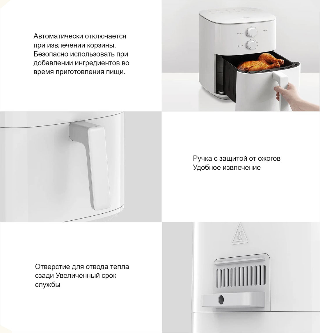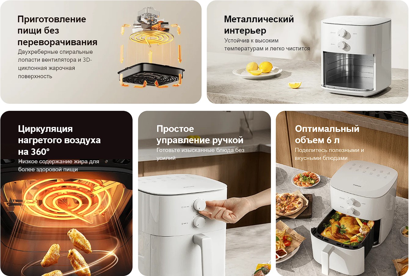 Аэрогриль Xiaomi Air Fryer объемом 6 литров обеспечивает равномерное приготовление пищи без необходимости переворачивания. Модель использует передовую технологию циркуляции горячего воздуха на 360°, сокращая количество масла и жира, а также оснащена улучшенным воздуховодом. Благодаря мощности 1550 Вт эта машина удовлетворит запросы даже самых взыскательных гурманов.