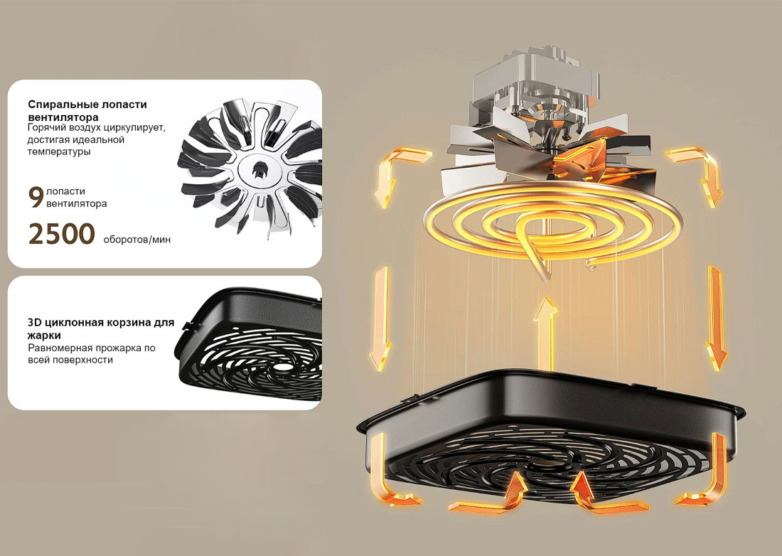Двухреберные спиральные лопасти вентилятора и 3D-циклонная жарочная поверхность обеспечивают конвекционный нагрев на 360° для равномерного приготовления пищи без необходимости переворачивания.