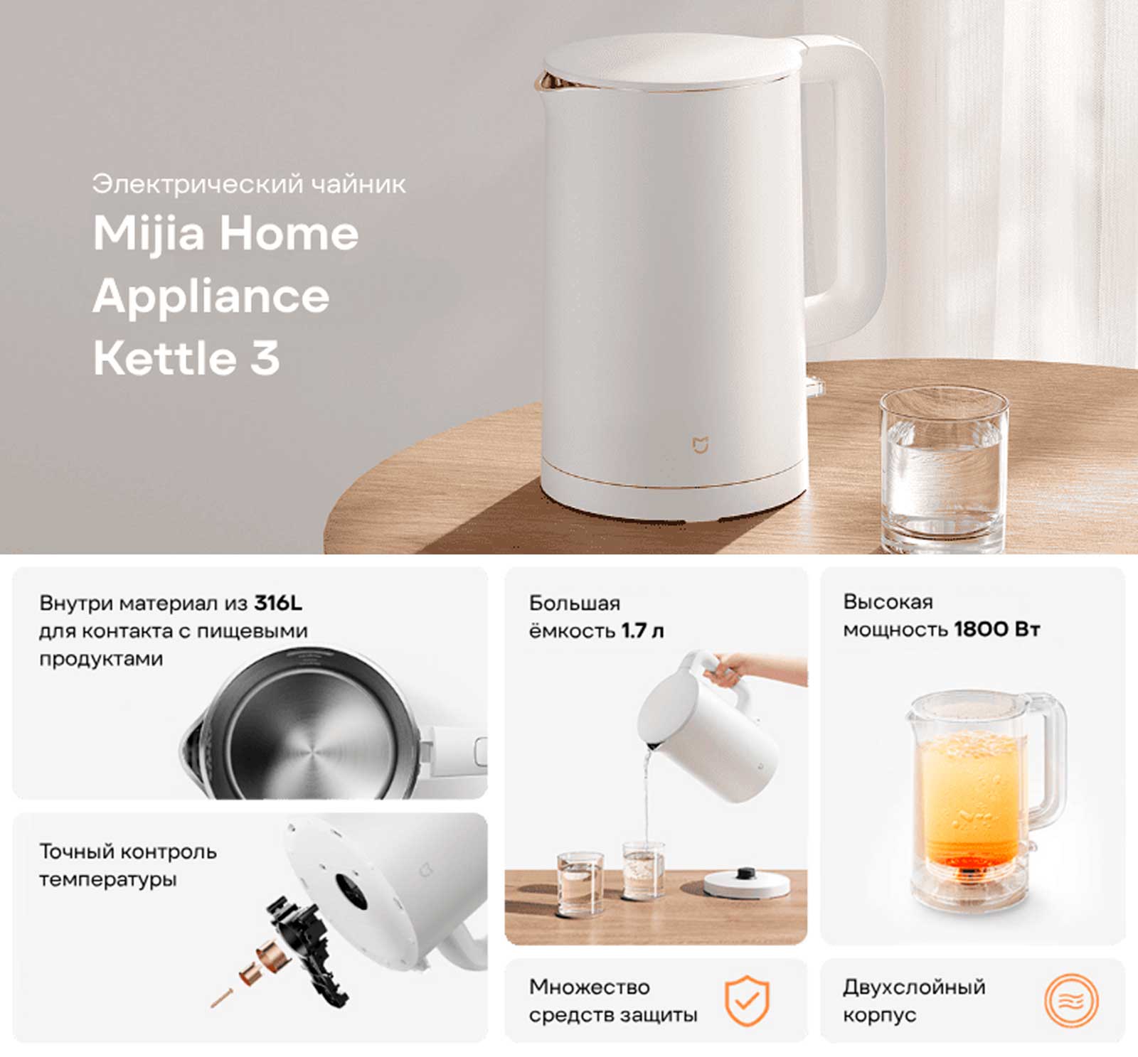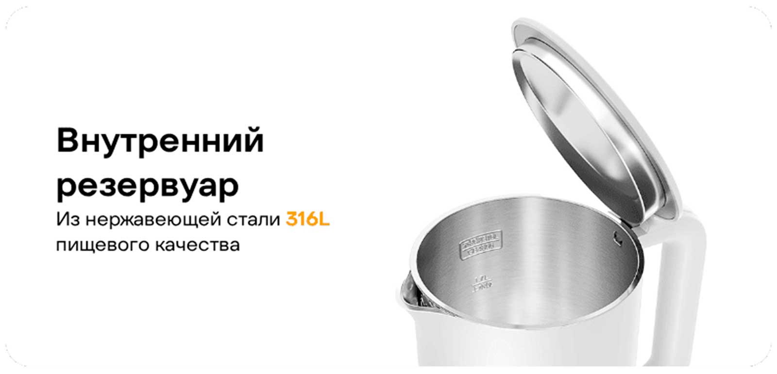 Сердцем чайника Mijia Kettle 3 является внутренний резервуар из пищевой нержавеющей стали 316L, тщательно отобранный с учетом требований к здоровью и безопасности. Этот высококачественный материал устойчив к коррозии, не ржавеет и