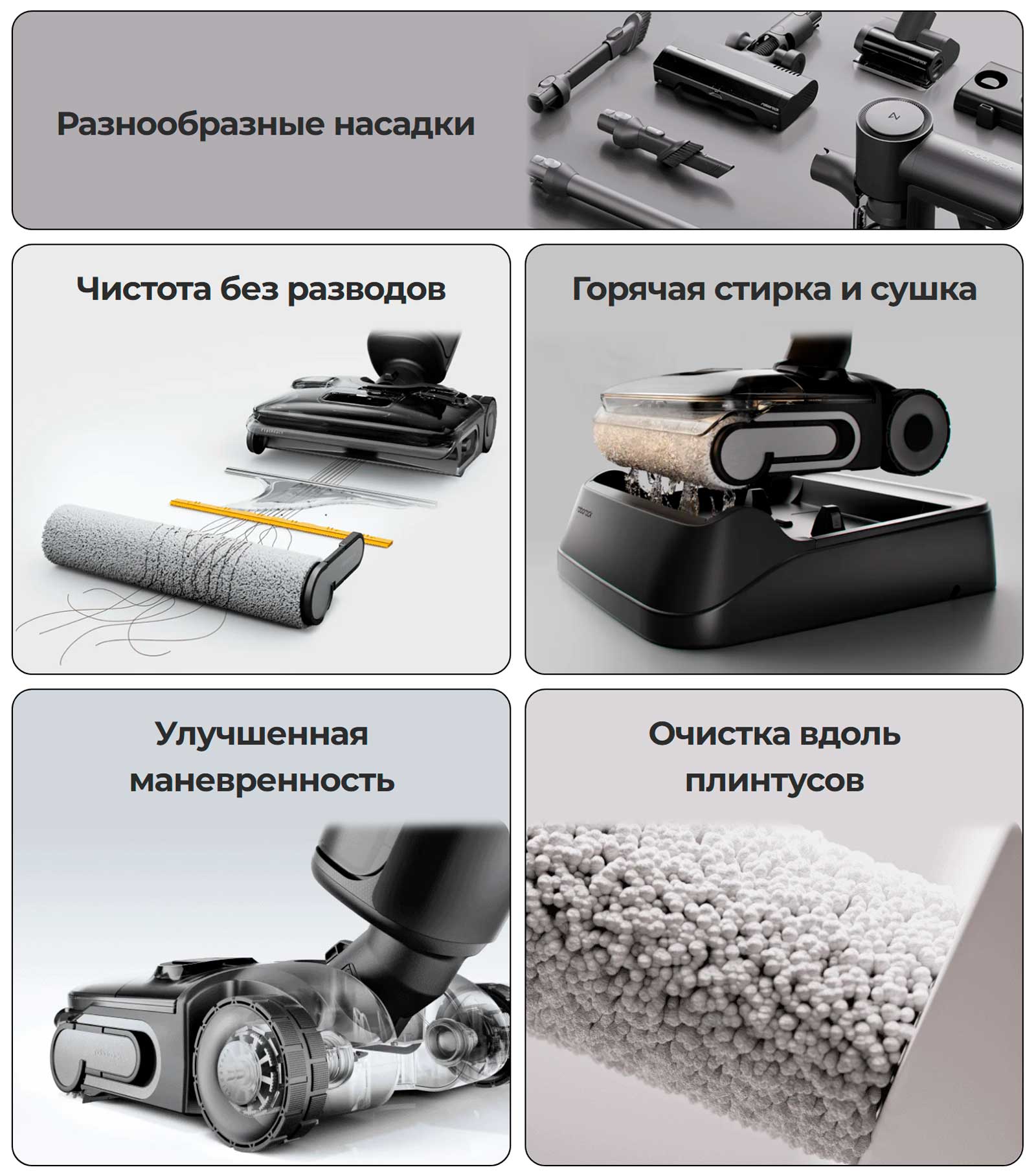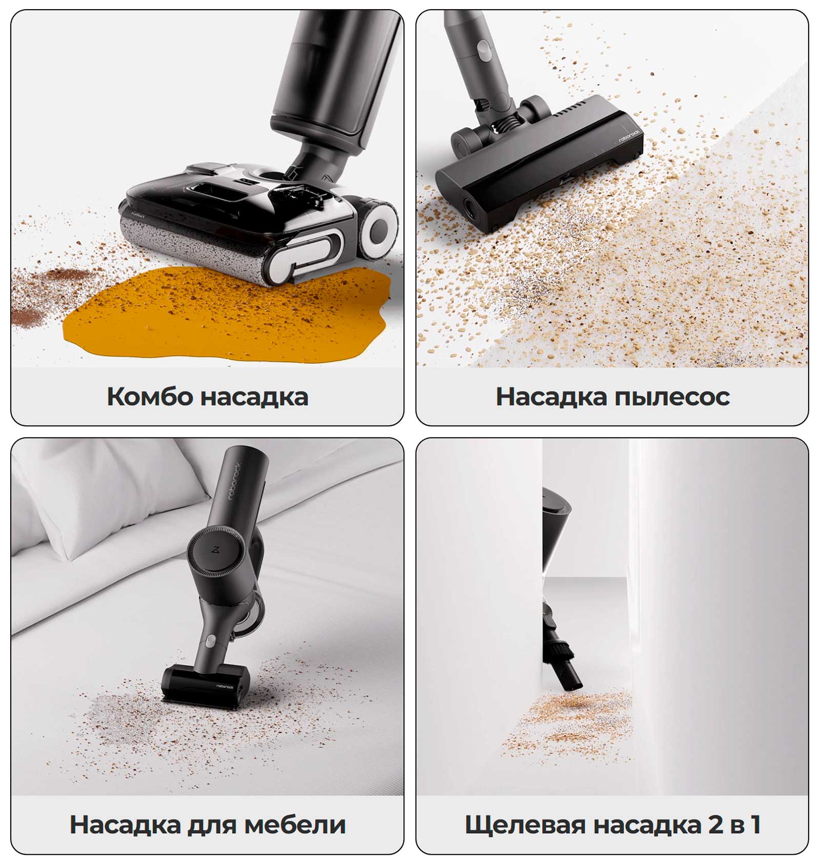 Сменные насадки превращают Roborock F25 Combo в универсального помощника для уборки любых поверхностей. Он одинаково эффективно очищает полы, мебель и труднодоступные участки, обеспечивая безупречную чистоту в доме.