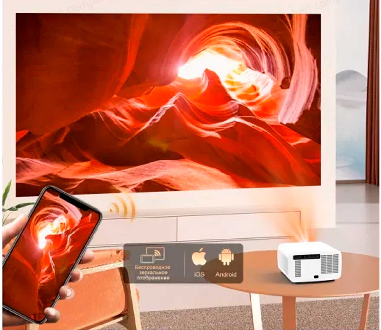 Проектор поддерживает технологии AirPin, Miracast и Wi-Fi, обеспечивая беспроводное подключение к Android- и iOS-устройствам. Это упрощает трансляцию видео, фото и презентаций без кабелей. Настройка занимает всего несколько секунд.