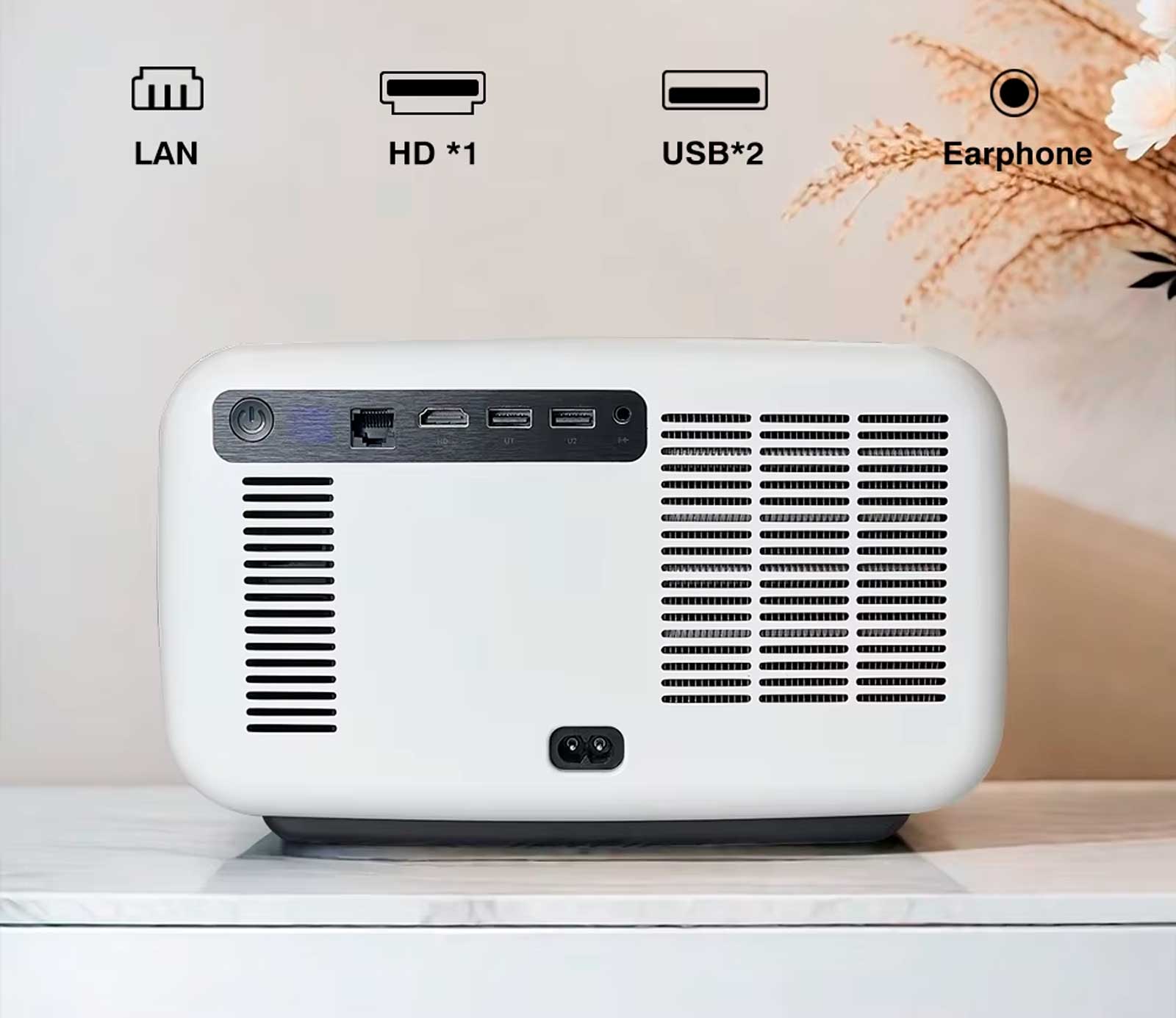 Проектор оснащён всеми необходимыми разъёмами для удобного использования: 1× HDMI для подключения приставок и ноутбуков, 2× USB для флешек и внешних накопителей, LAN-порт для стабильного интернет-соединения и аудиоразъём для