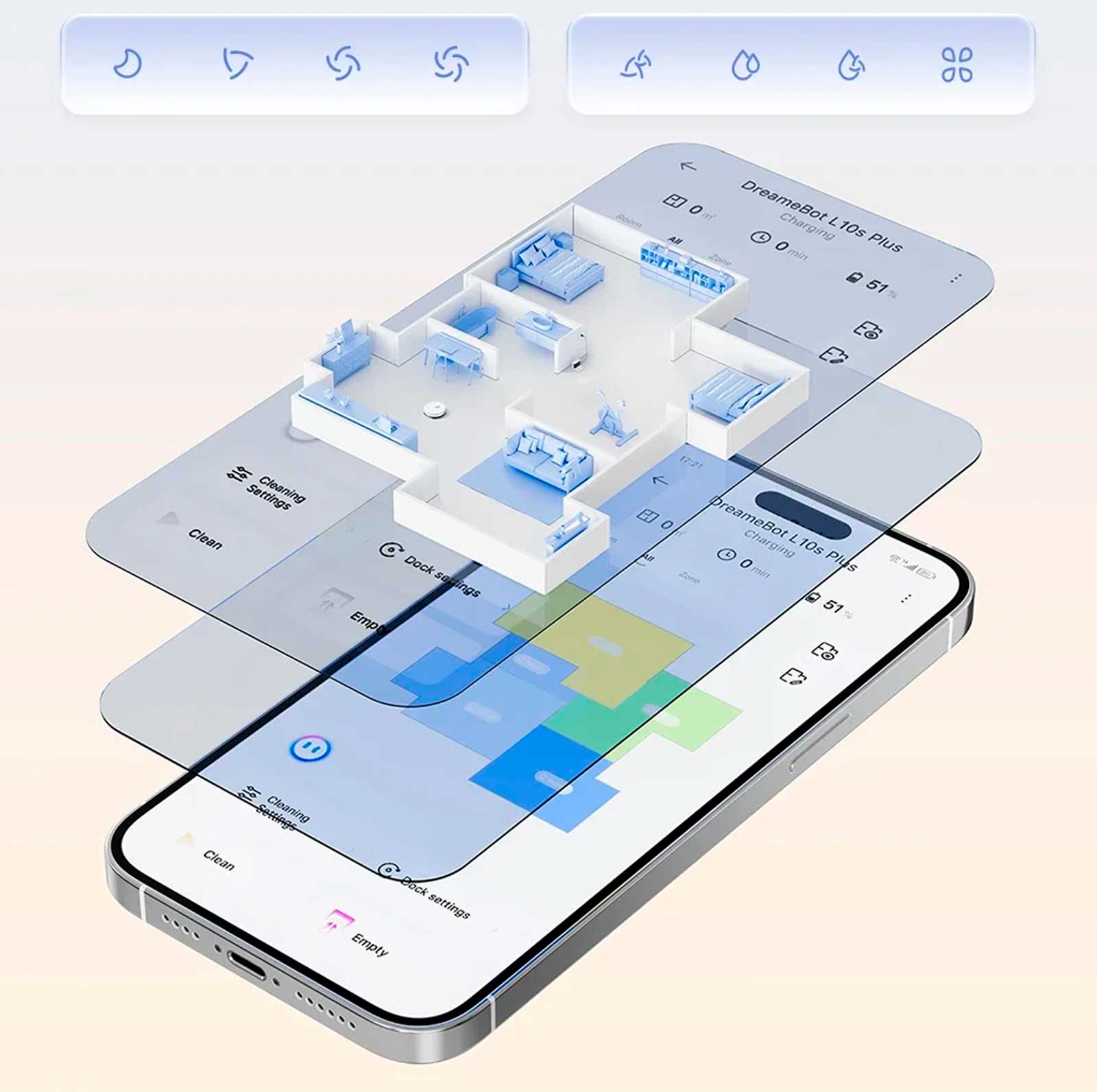 Персонализируйте уборку в соответствии со своими потребностями с помощью приложения Dreamehome. Создавайте до 4 отдельных карт этажей и настраивайте порядок действий, мощность всасывания и режимы. Установите запретные зоны и