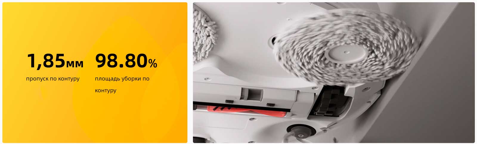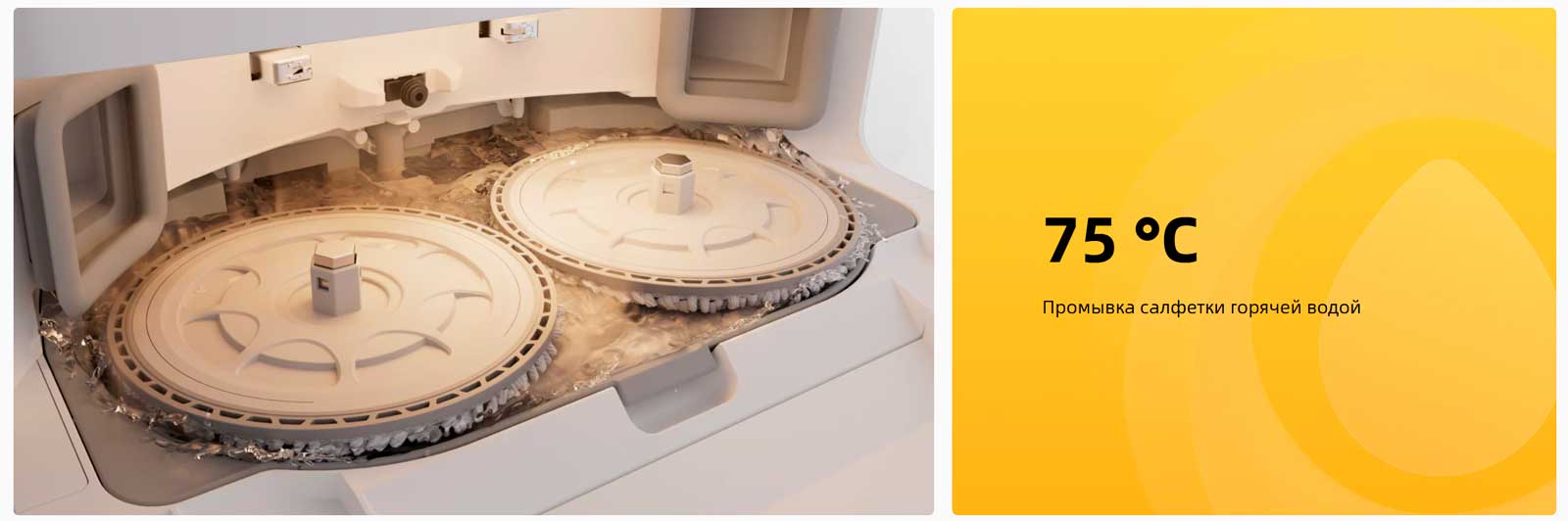 Оснащенный двумя подъемными вращающимися салфетками, робот справляется со въевшимися пятнами на твердых полах. Кроме того, при обнаружении ковров салфетки автоматически поднимаются, чтобы сохранить ковры сухими, обеспечивая