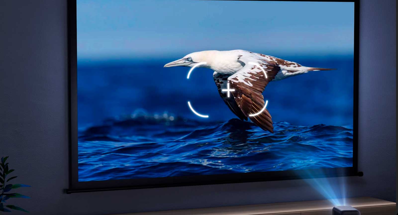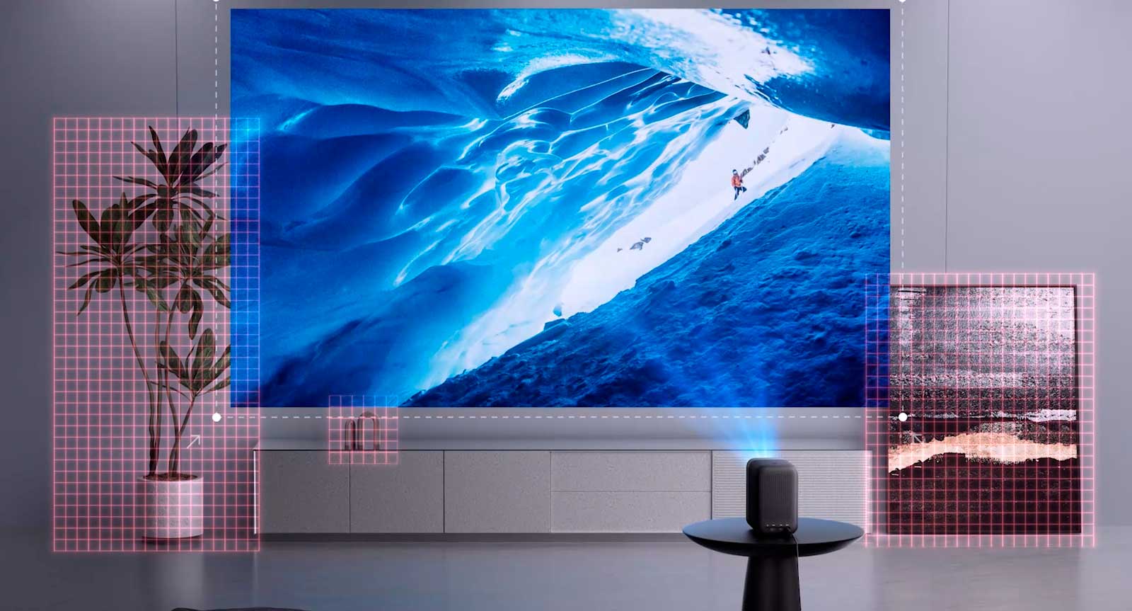 Высокоточная камера работает в сочетании с алгоритмами искусственного интеллекта, позволяя проектору обнаруживать и обходить препятствия на стене, такие как выключатели и рамы для картин, обеспечивая чистую область проекции и