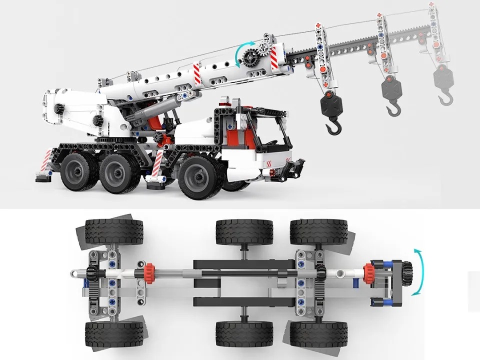 В автокране Mitu используется механизм рулевого управления. Кроме того, машинка оборудована колесами с прочными шинами, оказывающими амортизирующий эффект и благодаря которым автокран может перемещаться на различных типах