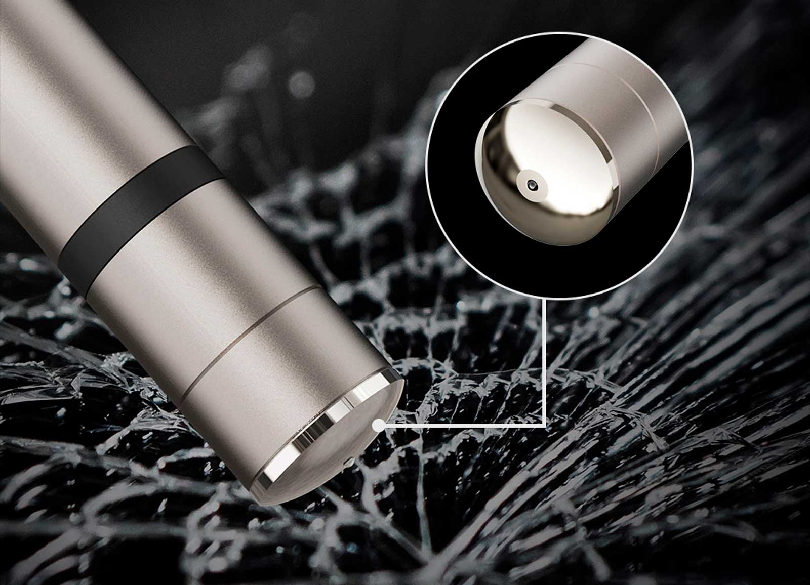 В хвостовой части встроен прочный заостренный наконечник для разрушения стекла. Позволяет разбить окно при экстренной эвакуации.
