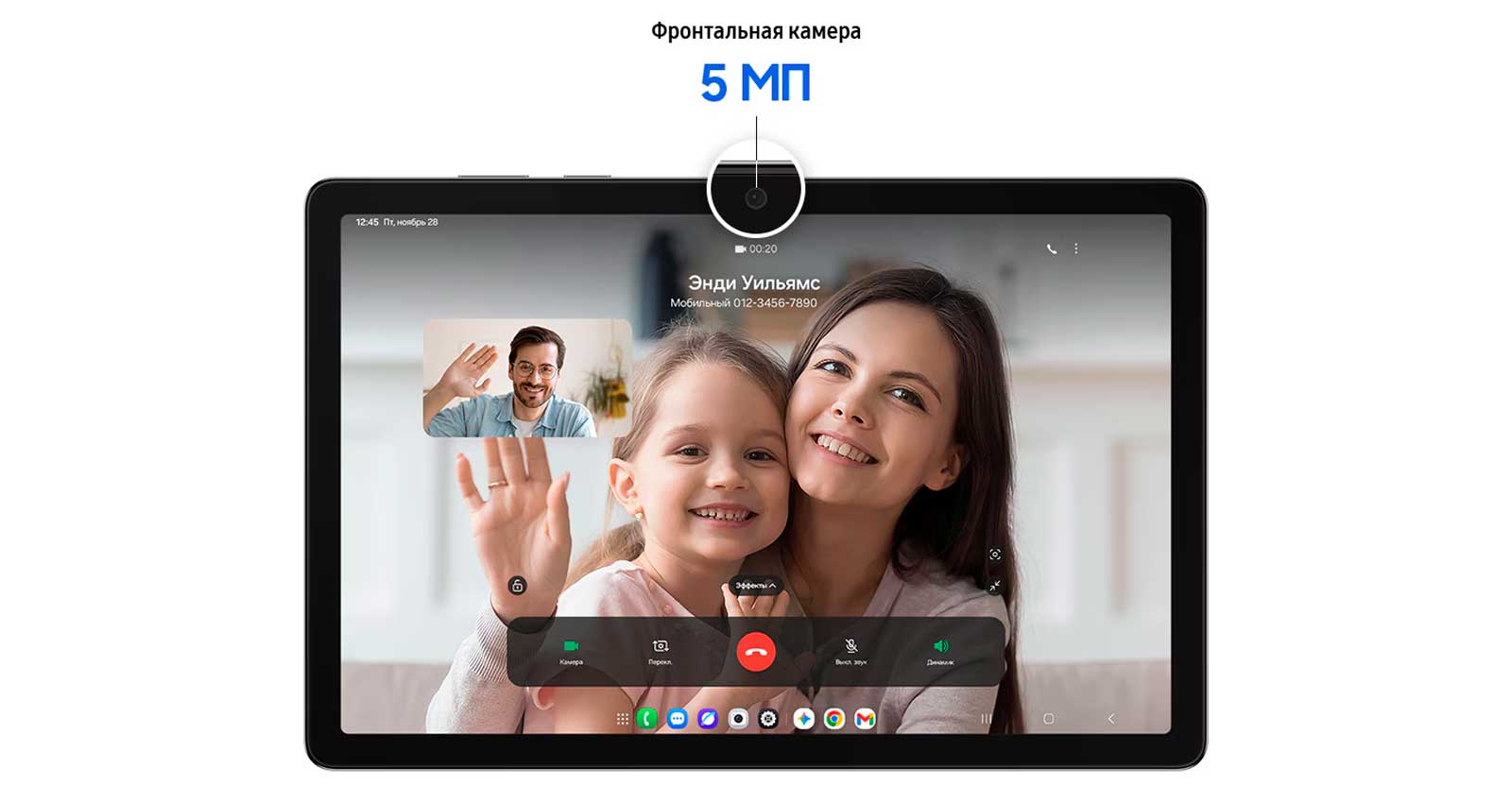 Поддерживайте общение с близкими людьми. Galaxy Tab A11+ оснащен фронтальной камерой 5 МП для более четкой картинки во время видеозвонков. Общаетесь ли вы с семьей или работаете с командой, улучшенная четкость позволяет лучше видеть детали мимики лица собеседника