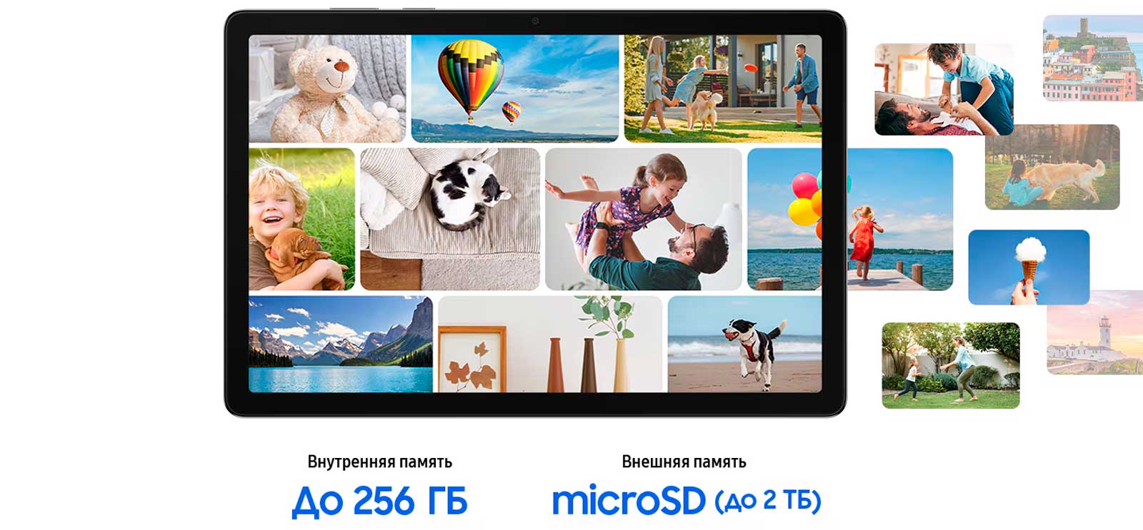 Galaxy Tab A11+ оснащен большим объемом оперативной и встроенной памяти. Благодаря ОЗУ до 8 ГБ планшет легко поддерживает режим многозадачности, а встроенной памяти будет достаточно для хранения необходимых файлов и установки приложений. При необходимости её можно расширить до 2 ТБ с помощью карты памяти microSD.