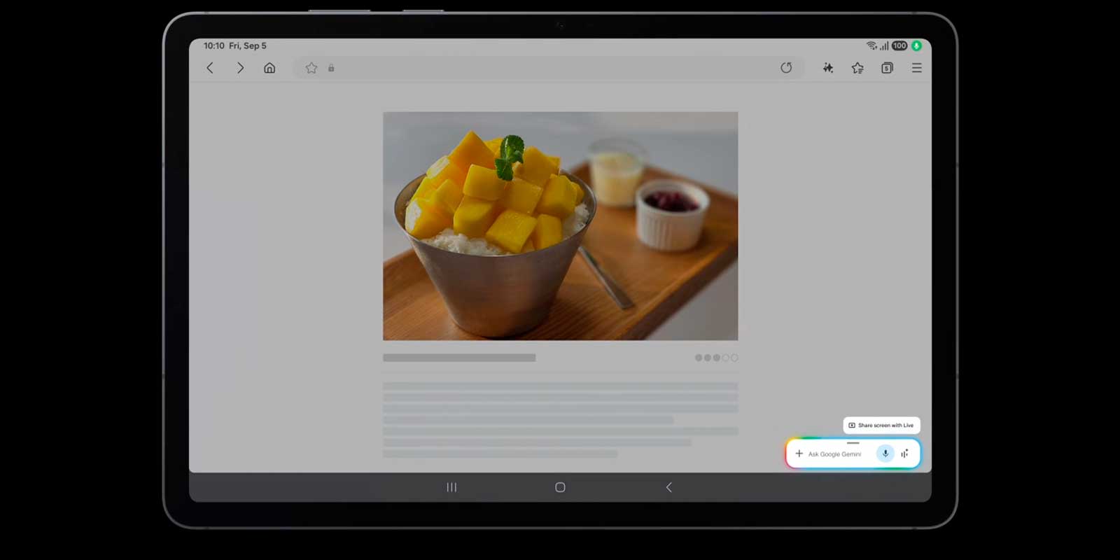 Используйте функцию демонстрации экрана на Galaxy Tab S11, чтобы получать информацию в режиме реального времени с помощью Gemini Live. Просто нажмите и удерживайте боковую кнопку, чтобы начать работу, и поделитесь своим экраном с