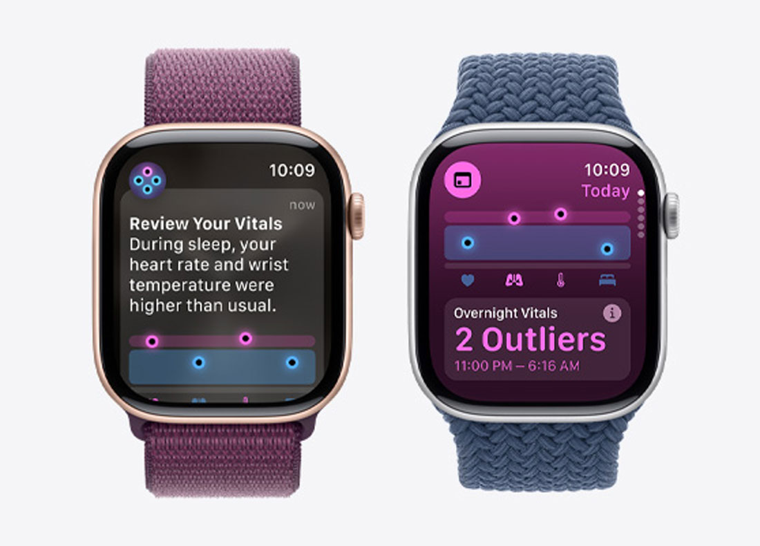Новое приложение Vitals помогает вам определять изменения в вашем ежедневном состоянии здоровья. Быстро просматривайте основные показатели здоровья за ночь прямо на запястье — включая частоту сердечных сокращений, частоту дыхания, температуру запястья и продолжительность сна.