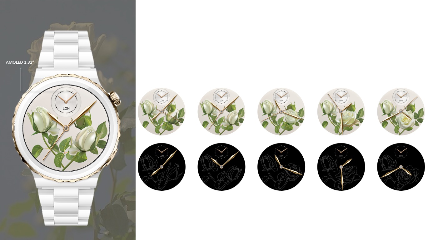 Пять различных эффектов циферблата показывают различные формы цветка с течением времени.