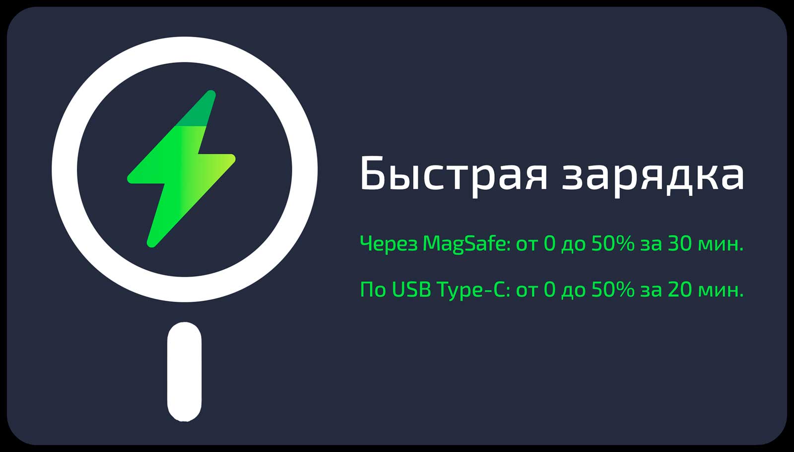MagSafe с поддержкой Qi2 отстаёт не сильно: до 25 Ватт (при мощности источника питания не менее 30 Ватт) и всего 30 минут на зарядку полностью разряженного устройства до тех же 50%. Таким образом, обеспечить себе лишних полдня