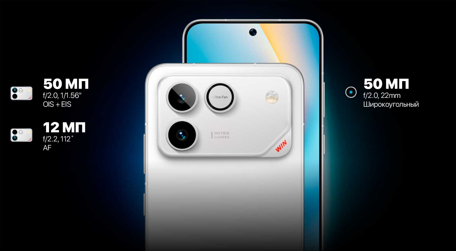 МП сенсор Sony LYT-700 и 12-мегапиксельный сверхширокоугольный объектив, что обеспечивает гибкость съёмки — от детализированных портретов до панорамных сцен. Такая конфигурация выводит Honor Win RT в категорию устройств,