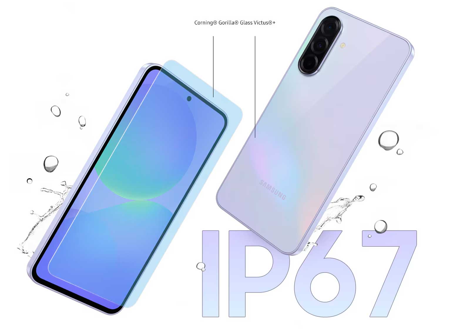 Прочное стекло Corning® Gorilla® Glass Victus®+ формирует особый дизайн Galaxy A36 5G. Кроме того, благодаря защите IP67 ваш смартфон будет защищен от загрязнений и брызг воды.