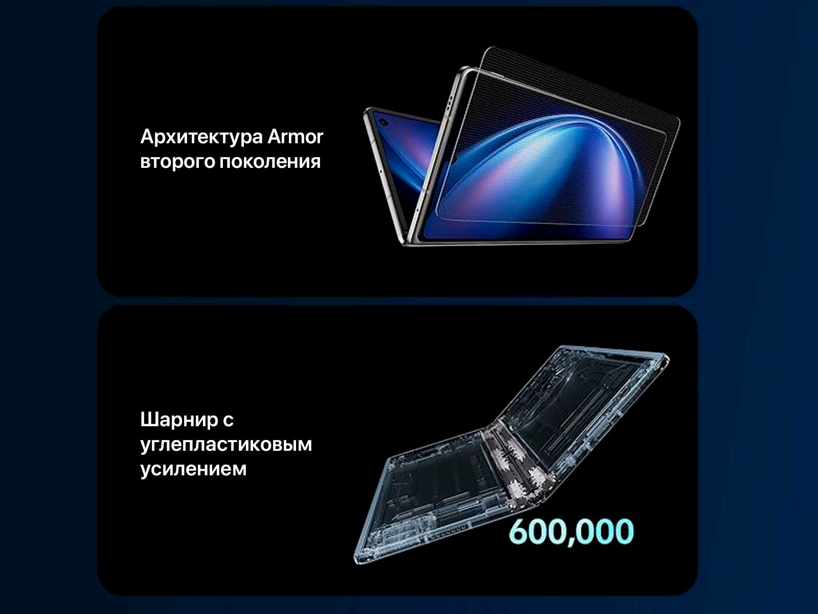 Экран повышенной прочности со стеклом Armor Glass 2-го поколения надёжно защищает от падений и ударов. Уникальный шарнир ротационно-сдвижной конструкции минимизирует складку и обеспечивает плавную синхронизированную работу