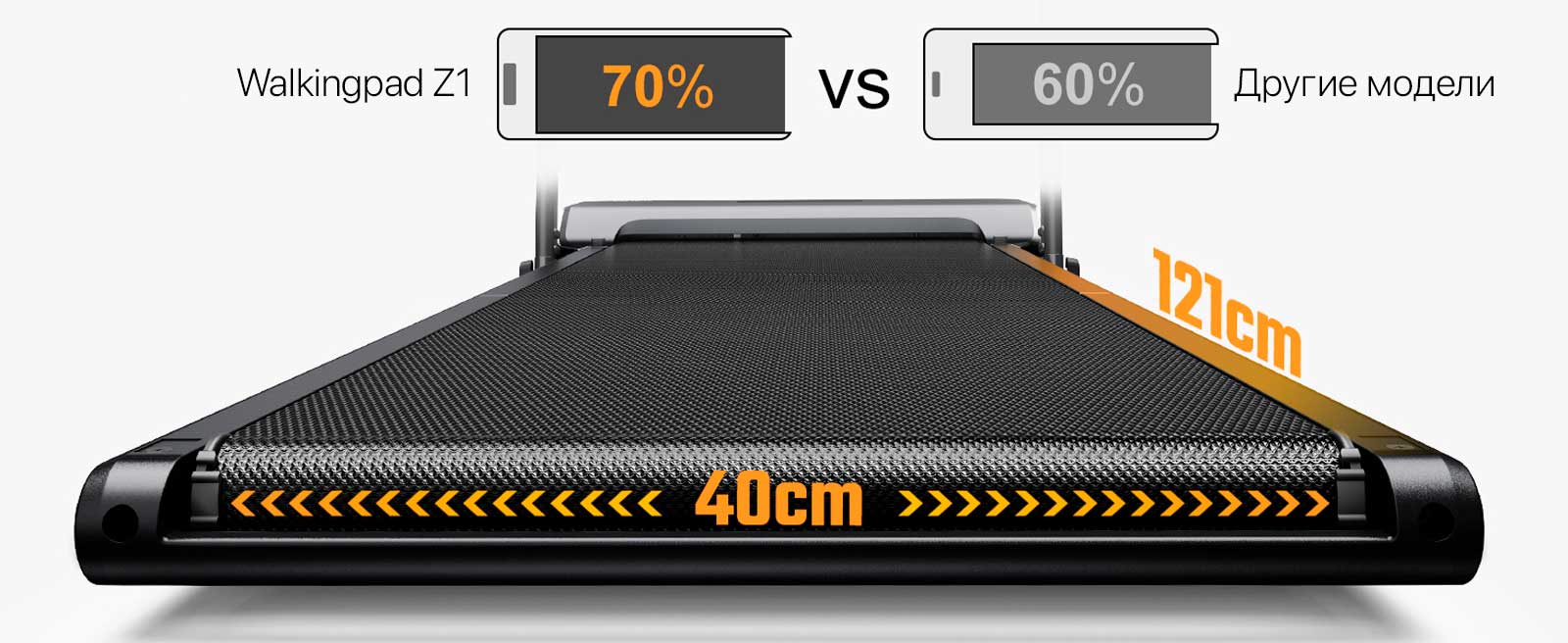 Беговая дорожка Walkingpad Z1 оснащена увеличенным полотном шириной 40 см и длиной 121 см, что обеспечивает комфорт и безопасность во время тренировок. Благодаря продуманной конструкции эффективность занятий достигает 70 %, что