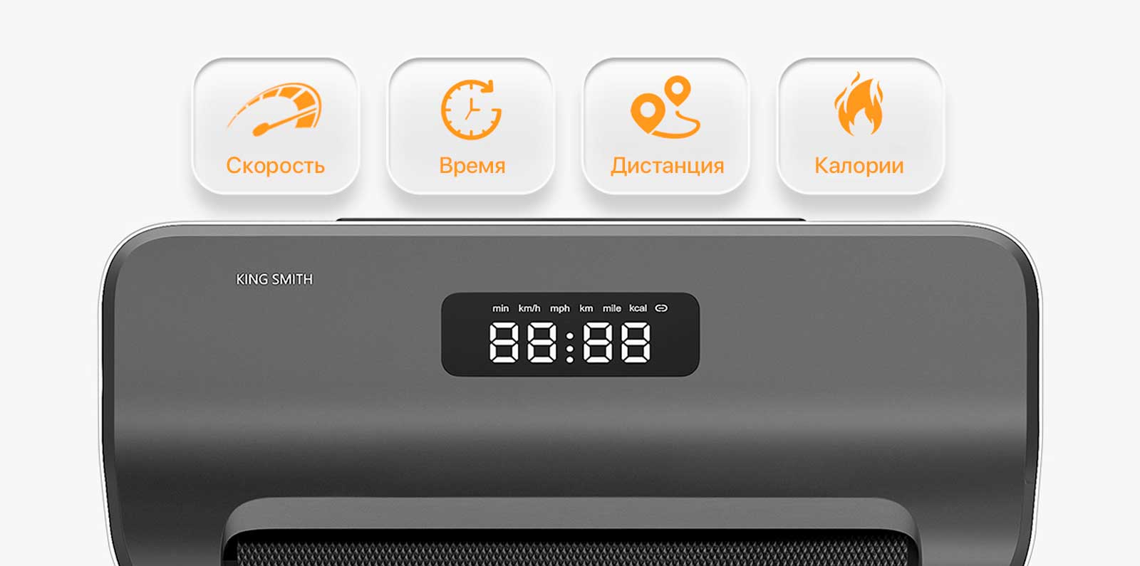 Минималистичный LED-дисплей дорожки для ходьбы KingSmith WalkingPad Z1 отображает основные параметры тренировки, такие как текущая скорость, время тренировки, пройденное расстояние и приблизительное количество сожженных калорий.