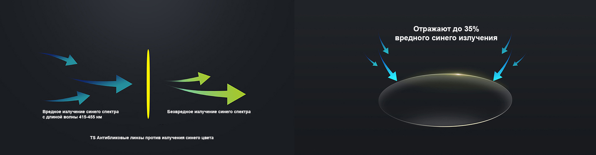 линзам, изготовленным с применением наноматериалов, очки могут отражать около 35% вредного синего излучения и до 100% ультрафиолетовых волн солнечного света длиной до 400 нм, обеспечивая безопасность ваших глаз и главное –