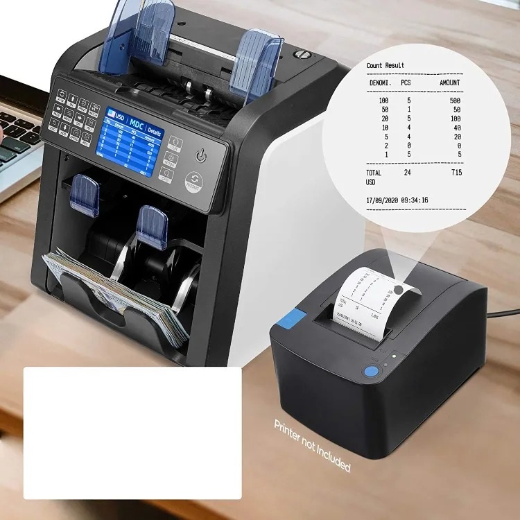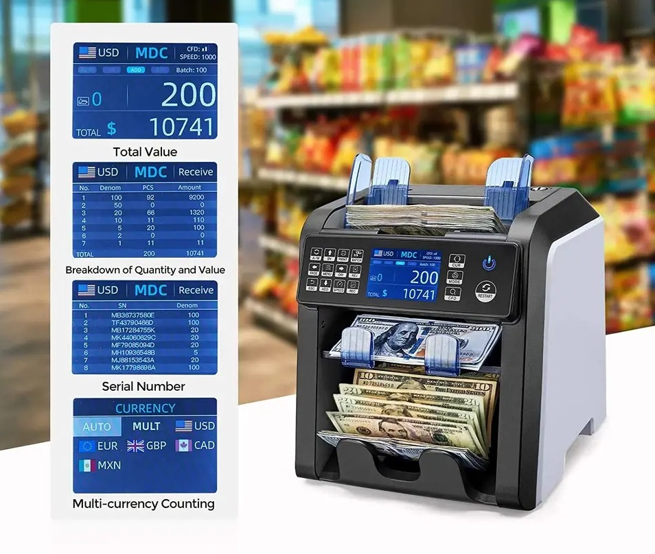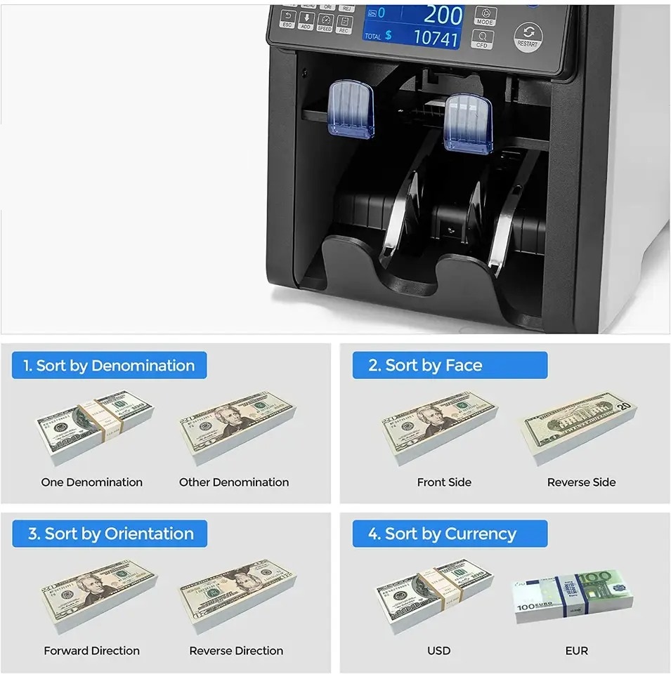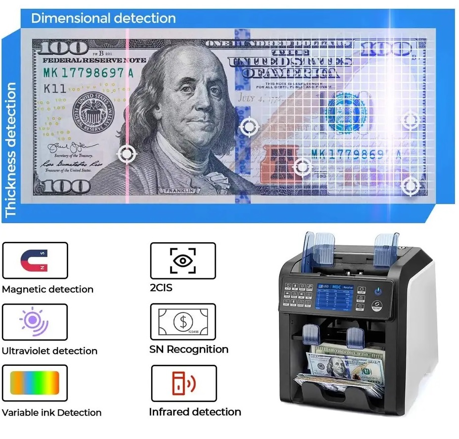 банкнот. Счетная машинка сортирует банкноты по номиналу, по лицевой и тыльной стороне, по ориентации верх-низ и по валюте. Проверяет валюты на подлинность: UV, MG, IR, IMAGE, MT, DB IR, Size Paper по образу. Два CIS - сканера (100%