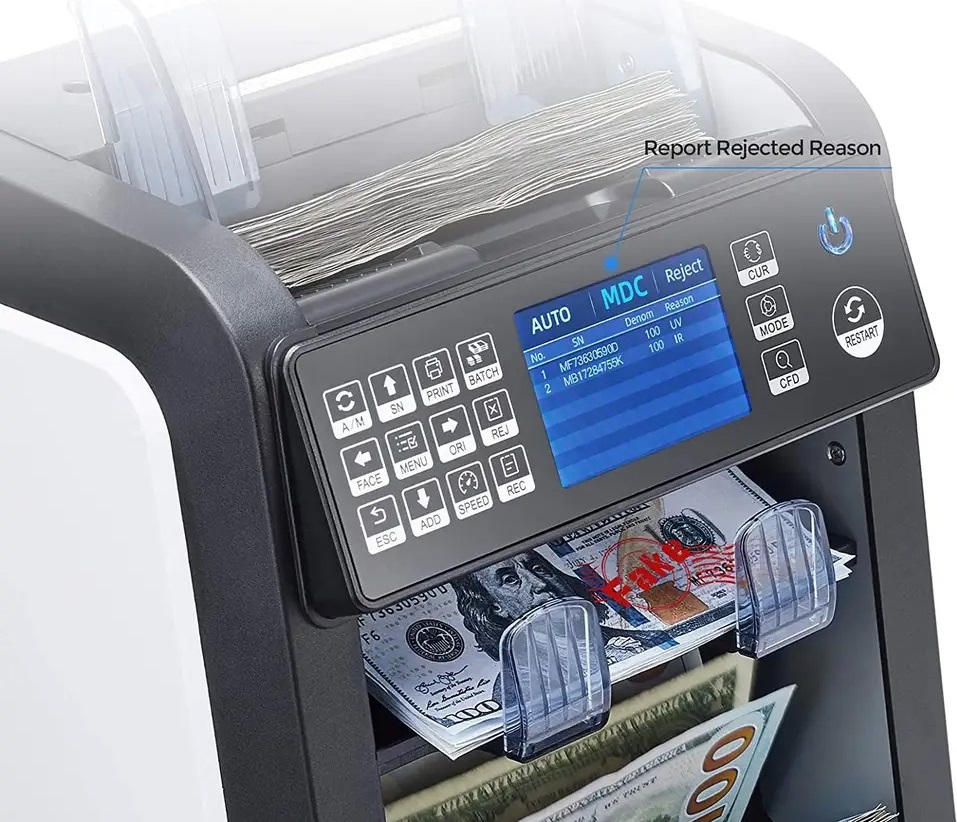 Удобные кнопки. Дисплей для отображения итогов счета и фасовки. Счетчик может работать в режимах: простой пересчет, сортировка и счет с детекцией. В случае обнаружения подозрительной банкноты раздастся звуковой сигнал и на дисплее