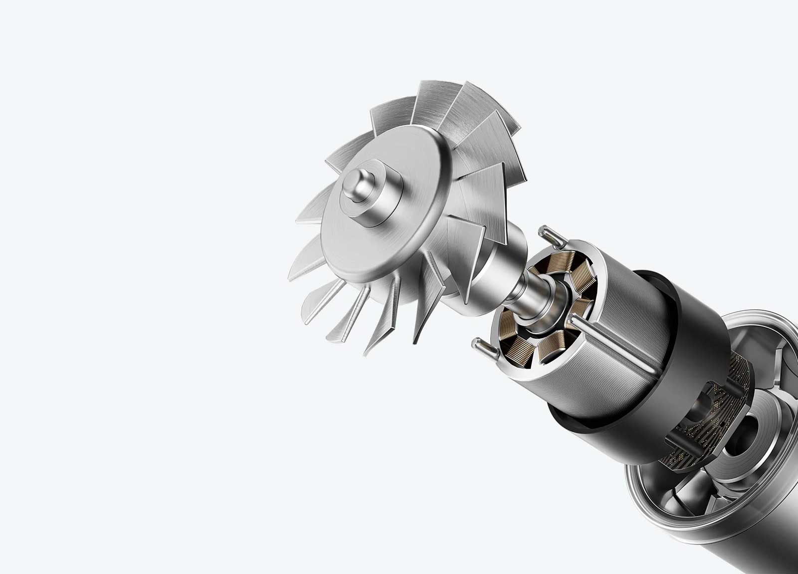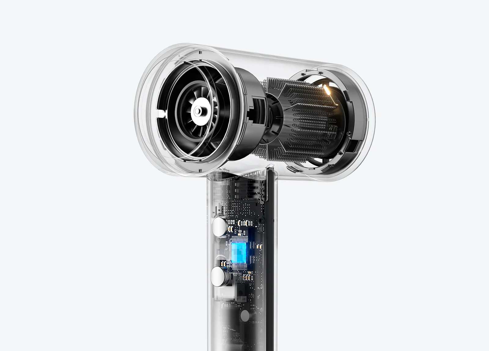 Вдохновленный принципами работы авиационных двигателей фен оснащен высокоскоростным мотором, скорость которого достигает 110 000 об/мин, и 13 турбинными лопастями в форме крыльев, которые создают воздушный поток, нагнетая воздух из