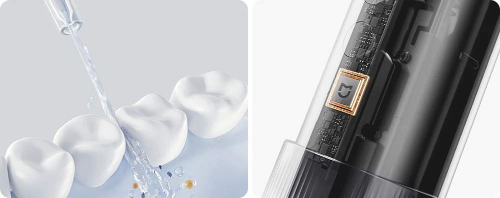 Mijia F400 не просто удаляет налет между зубами. Тонкая центральная колонна воды безупречно очищает межзубные промежутки, а окружающая ее круговая водяная завеса бережно массирует десны и деликатно очищает область десневого треугольника. Эта уникальная технология увеличивает площадь очистки в 7 раз, даря вам безупречную чистоту и здоровье зубов.
